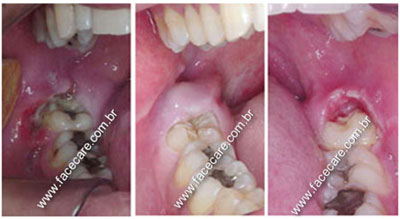 Observe na extremidade da seta a presença da Pericoronarite pela presença de um siso superior semi-incluso. Na foto ao lado podemos observar que após três dias da extração deste dente o tecido já está praticamente saudável.