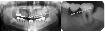 Observe nas radiografias panorâmica e periapical acima a região do terceiro molar inferior esquerdo que está inclinado e ancorado na raiz do segundo molar. Este segundo molar é um dente pilar de uma prótese parcial fixa e foi perdido pela infiltração ao redor das suas raízes. Devido a presença do terceiro molar, o paciente além de sofrer sua extração perdeu também o segundo molar e a prótese fixa.