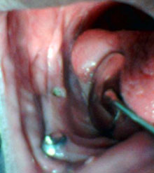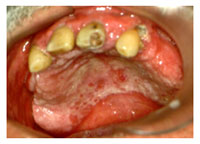 1 – Boca seca ou secura da boca (xerostomia), causada por diminuição da quantidade de saliva, desenvolvida em pacientes que são submetidos à radioterapia na região cabeça/pescoço onde as glândulas salivares são afetadas pela radiação. A xerostomia causa incomodo para falar e comer. Porém, o mais grave é que a falta de saliva diminui a proteção natural da boca e ela se torna mais vulnerável a infecções em geral, além de provocar mau hálito (halitose).